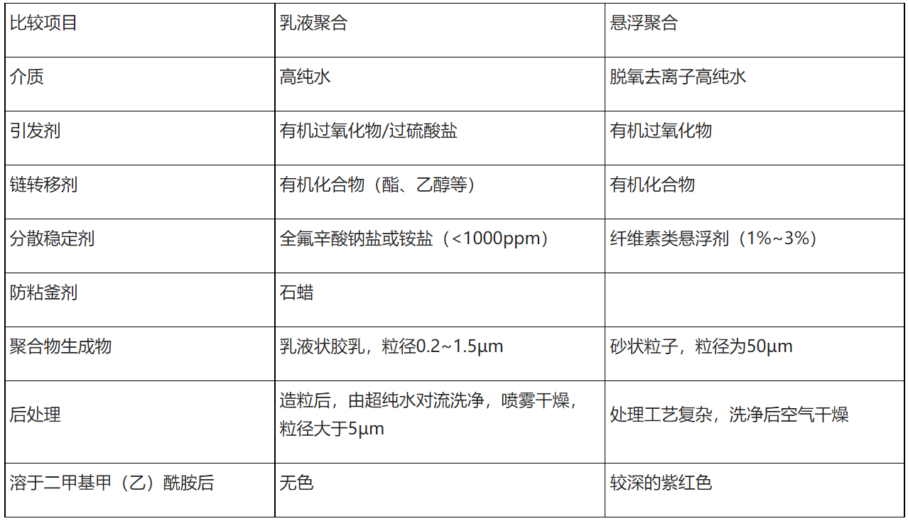 目前,PVDF的合成方法包括懸浮聚合和乳液聚合,這兩種聚合方法間的區(qū)別如下所示: