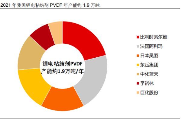 當(dāng)前常規(guī)級 PVDF 的生產(chǎn)技術(shù)已較為成熟,幾乎不存在技術(shù)壁壘,鋰電粘結(jié)劑 PVDF 生產(chǎn)技術(shù)要求較高,只有少數(shù)國外企業(yè)掌握并具備量產(chǎn)能力。由于技術(shù)壁壘高,少數(shù) PVDF 能夠量產(chǎn)通過電池廠商驗(yàn)證的鋰電粘結(jié)劑 PVDF 產(chǎn)品,2021 年我國鋰電粘結(jié)劑 PVDF 年產(chǎn)能預(yù)計(jì)僅 1.9 萬噸/年。