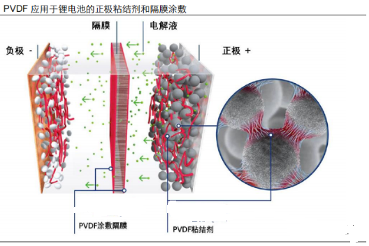 PVDF 在正極上可以粘接活性物質(zhì)、導(dǎo)電劑和集流體,保持活性物質(zhì)制漿時(shí)的均勻性和穩(wěn)定性,提供電極內(nèi)所需的電子傳導(dǎo),對電池的容量維持、使用壽命、穩(wěn)定性等起到至關(guān)重要的作用。