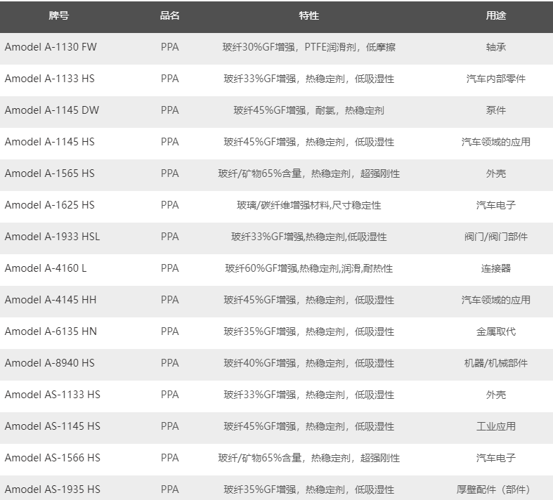 市售索爾維 Amodel PPA高溫工程塑料牌號(hào)列表如下:
