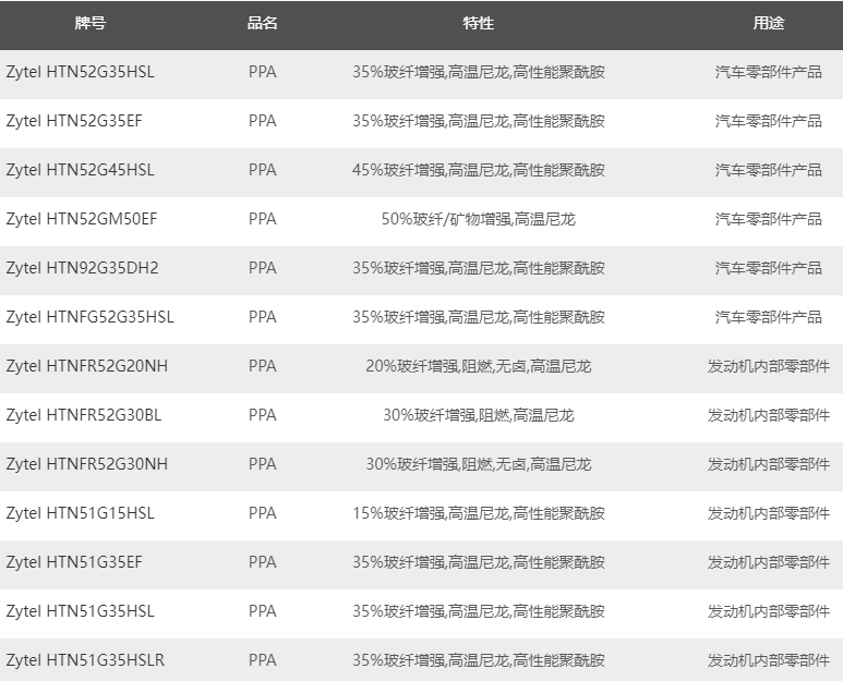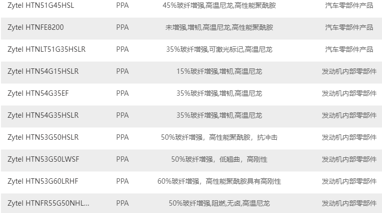 市售杜邦 Zytel HTN高溫尼龍牌號列表如下: