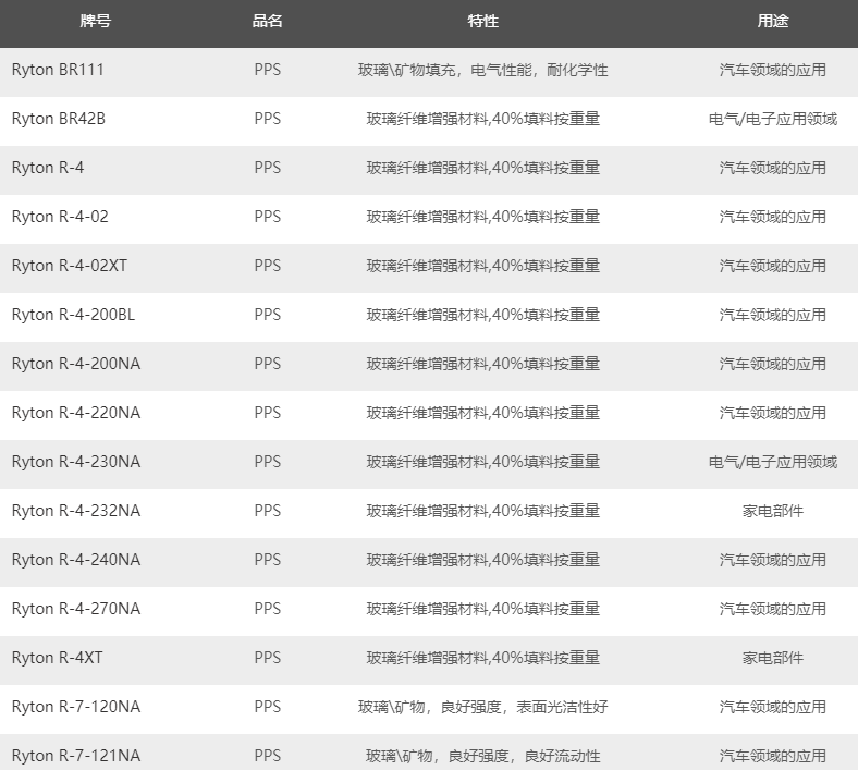 市場銷售索爾維Ryton PPS產(chǎn)品熱銷牌號(hào)如下: