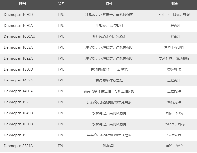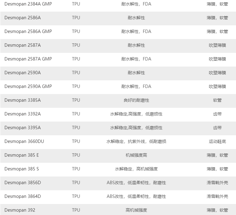 市銷科思創(chuàng)Desmopan TPU原料產(chǎn)品牌號(hào)如下: