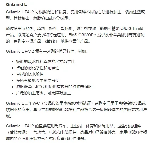 EMS-GRIVORY 是頂級的高性能聚酰胺專業(yè)制造商和供應(yīng)商,提供應(yīng)用范圍極廣的聚酰胺材料,Grilamid系列為尼龍PA12塑膠原料。