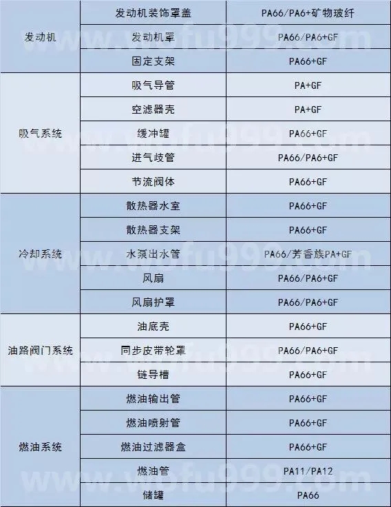 從中看出,經(jīng)過改性的PA材料在性能上會適應(yīng)很多汽車零部件的需求,一般填充、增強改性用的最多,另外在EPDM和POE增韌改性也有了很大市場,還有就是隨著汽車產(chǎn)業(yè)零部件的更新迭代,新能源汽車的發(fā)展在新能源電池及充電樁等的應(yīng)用,改性PA時對流動性,耐熱性及無鹵阻燃等性能都有很強烈的需求。