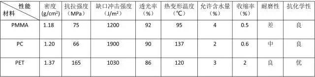 透明塑料首先必須有高透明度,其次要有一定的強度和耐磨性,能抗沖擊,耐熱性要好,耐化學性要優(yōu),吸水率要小,只有這樣才能在使用中,滿足透明度的要求而性能穩(wěn)定,PMMA、PC和PET的性能對比如下表所示。