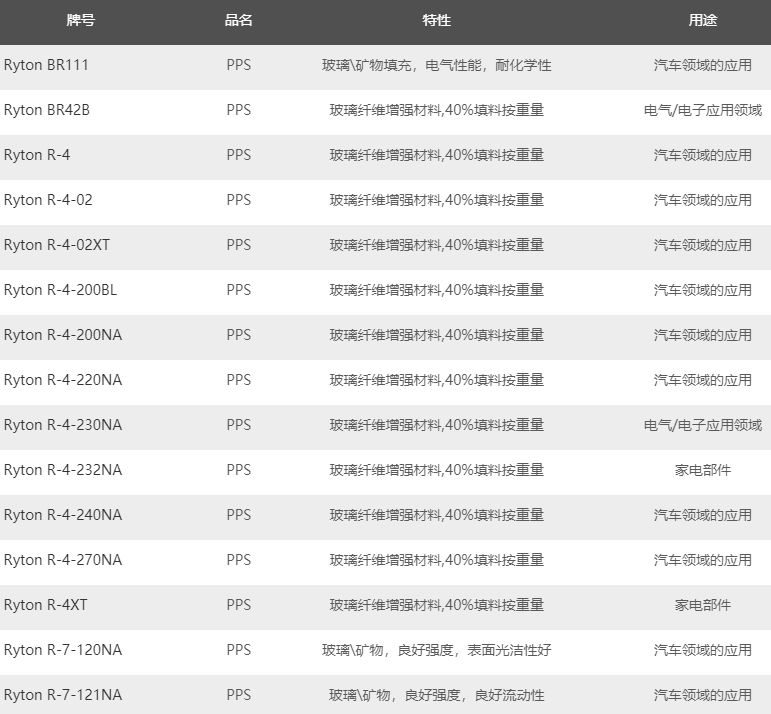 市銷比利時-索爾維Ryton PPS特種工程塑料牌號及應(yīng)用如下: