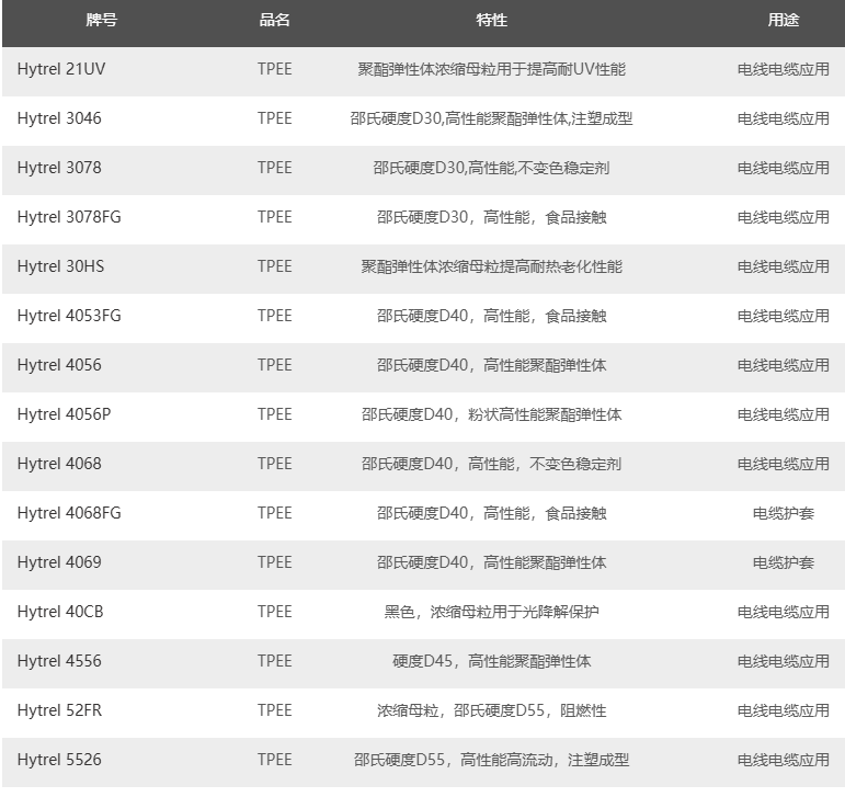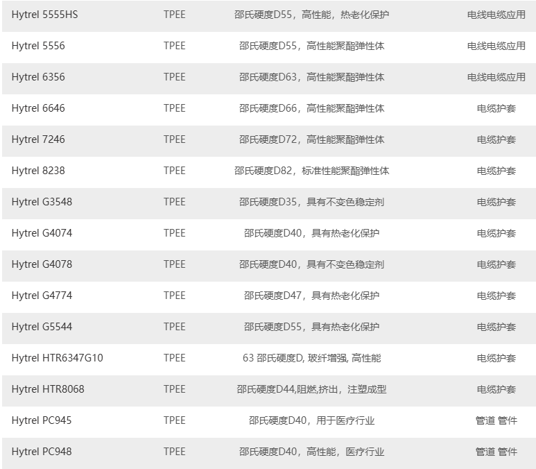 TPEE材料產(chǎn)品供應(yīng)有杜邦 Hytrel TPEE牌號如下: