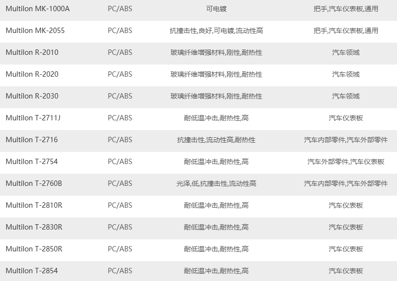 帝人Multilon PC/ABS塑料在汽車中的應用的產(chǎn)品牌號: