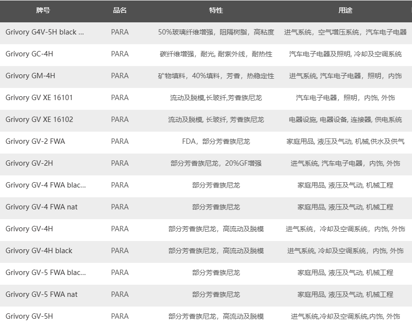 瑞士-EMS Grivory PARA聚酰胺產(chǎn)品供應(yīng)的各個(gè)型號(hào)及應(yīng)用如下