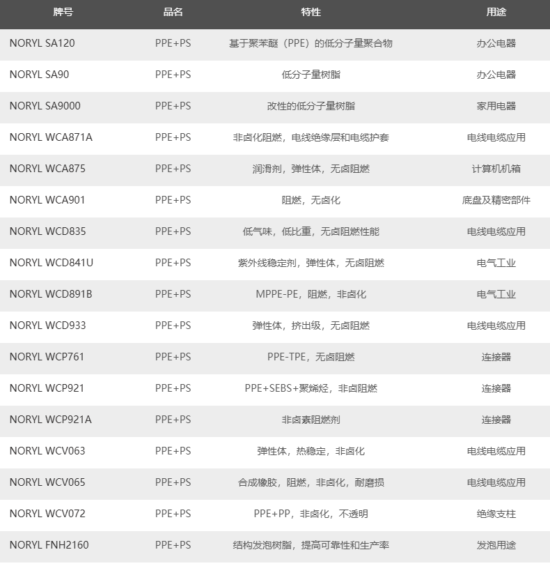 SABIC Noryl PPE/PS 樹(shù)脂產(chǎn)品牌號(hào)及應(yīng)用如下: