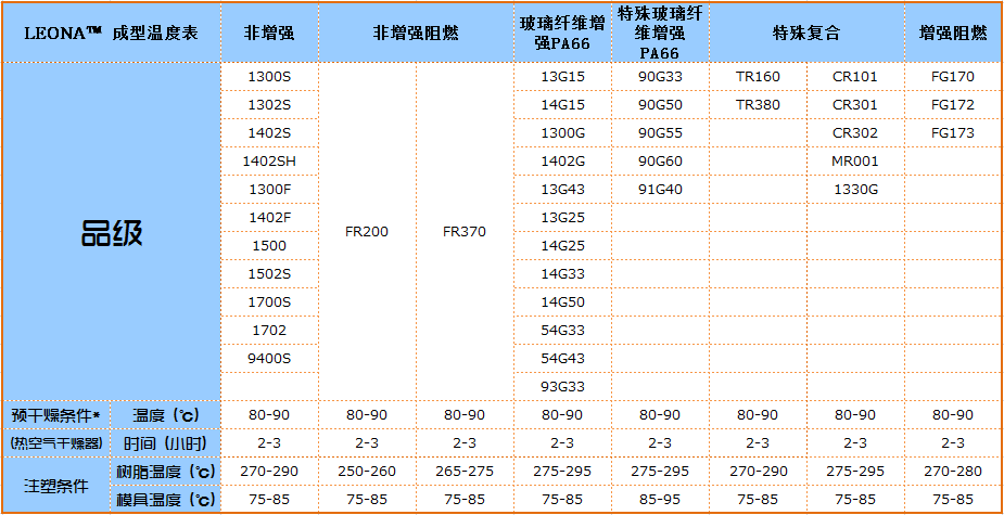 | 特殊等級 | PA66 91G40 | 表面平滑,低翹曲性。玻璃纖維和礦物填充 | 汽車外部零件 |