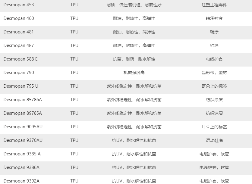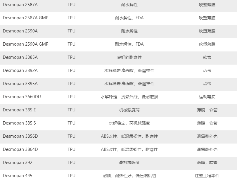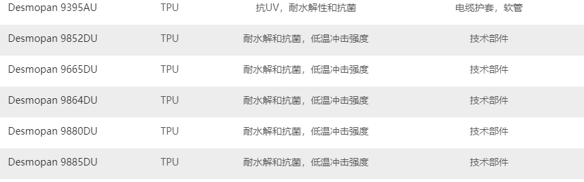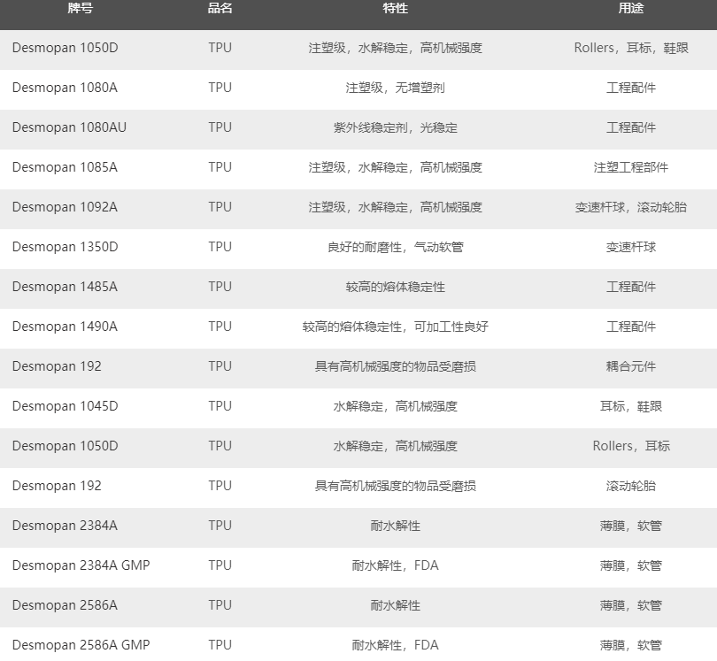 德國(guó)科思創(chuàng)TPU產(chǎn)品系列的主要牌號(hào)及基本性能描述: