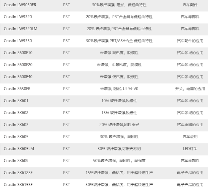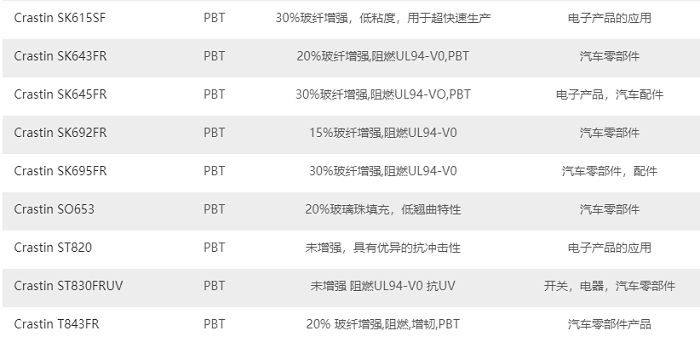 表1 PBT產(chǎn)品系列牌號大全