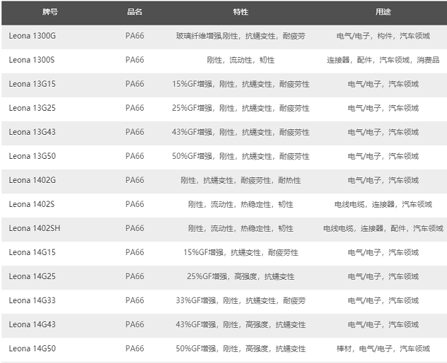 Leona PA66 - 系列產(chǎn)品尼龍66、以及大量共聚物尼龍。此外還為客戶的各種需求和應用提供各種等級的樹脂,其中包括非增強級、增強級、阻燃級、抗磨擦磨耗級、高沖擊級、碳纖增強,導電性。