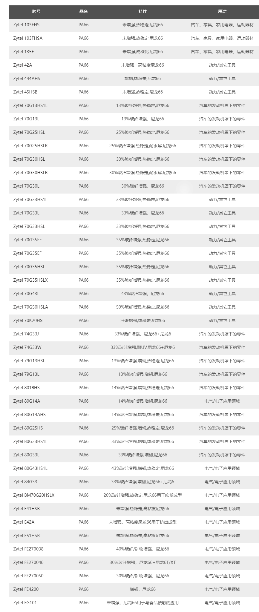 美國(guó)-杜邦Zytel? PA66產(chǎn)品牌號(hào)及應(yīng)用大全如下: