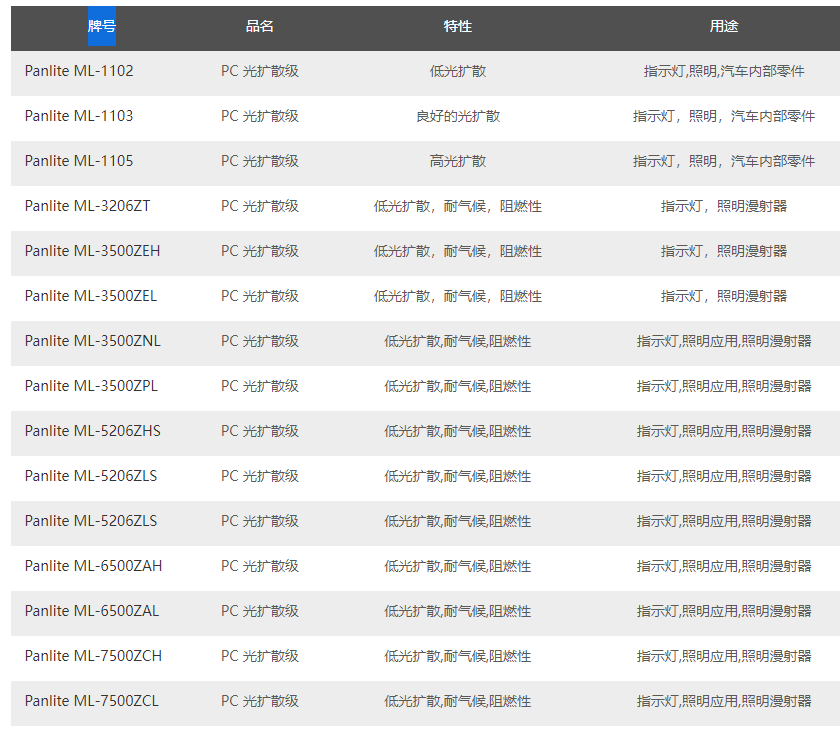 帝人PC光擴散規(guī)格Panlite ML系列的主要牌號及應用加工