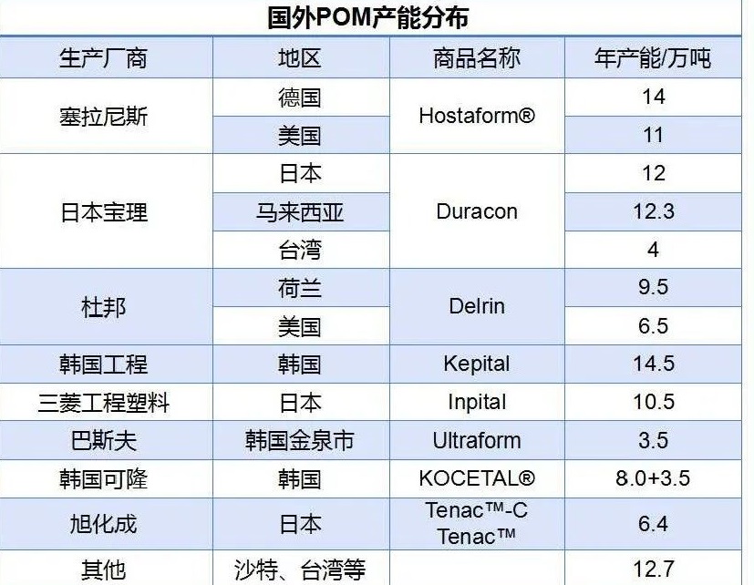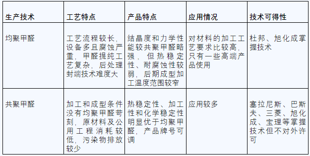 POM分為兩大類,一類為均聚甲醛,以杜邦和旭化成為代表,另一類為共聚甲醛,除了上述兩家,其他供應(yīng)商的產(chǎn)品基本都為共聚,旭化成則均聚和共聚都生產(chǎn)。