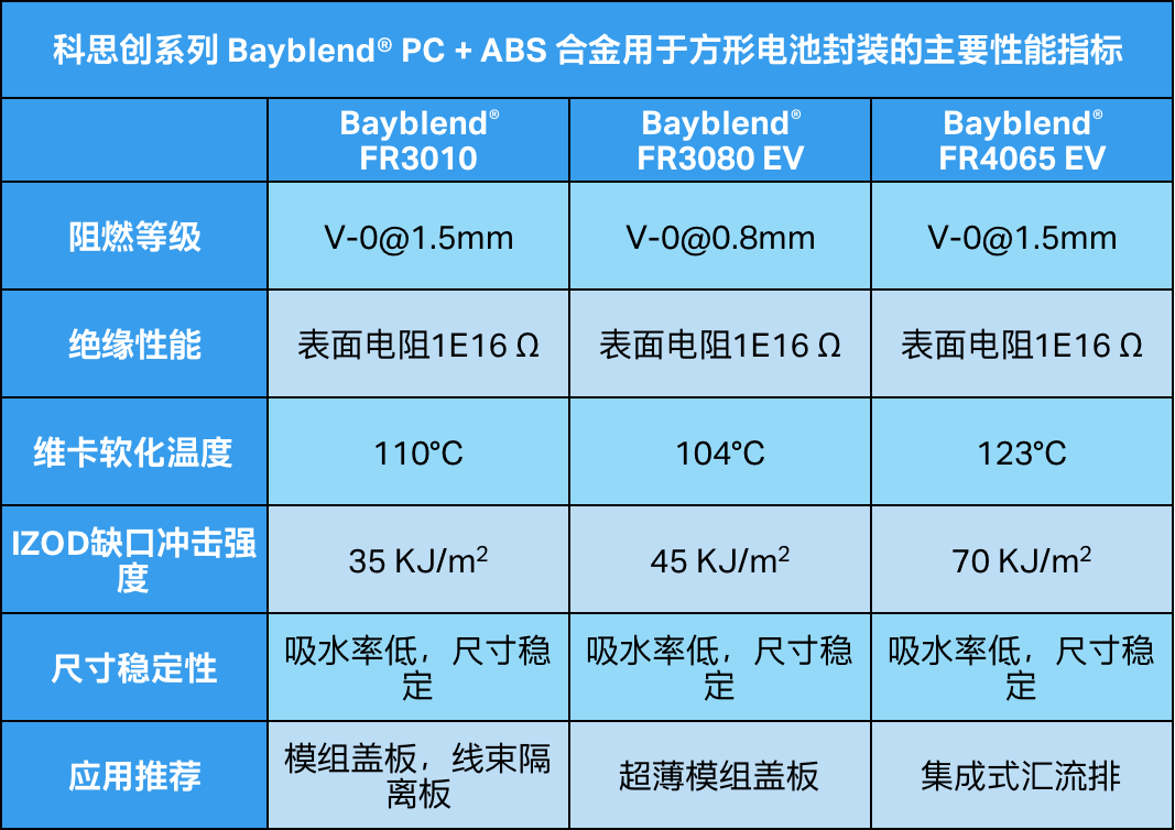 科思創(chuàng)高性能阻燃 PC+ABS 合金產(chǎn)品組合(Bayblend? FR3010,Bayblend? FR3080 EV,Bayblend? FR4065 EV)以其卓越的阻燃性能、穩(wěn)定可靠的電學(xué)性能和極其優(yōu)異的抗沖擊性能等優(yōu)勢,助力方形電池模組設(shè)計(jì)與制造走向 2.0 時代。