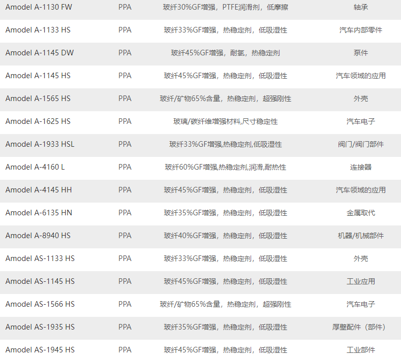 索爾維Amodel? PPA高溫尼龍產(chǎn)品的主要牌號