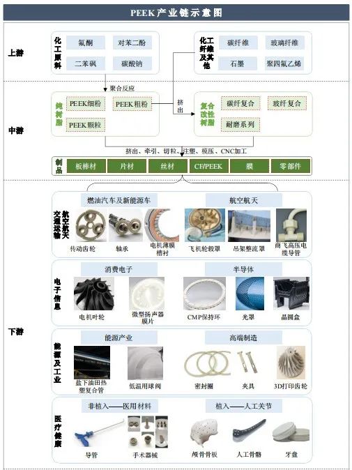 在產(chǎn)業(yè)鏈方面,PEEK 上游是化學(xué)原料和化學(xué)纖維制造行業(yè),下游則應(yīng)用于交通運(yùn)輸、航空航天、電子信息、能源及工業(yè)、醫(yī)療健康等行業(yè)。