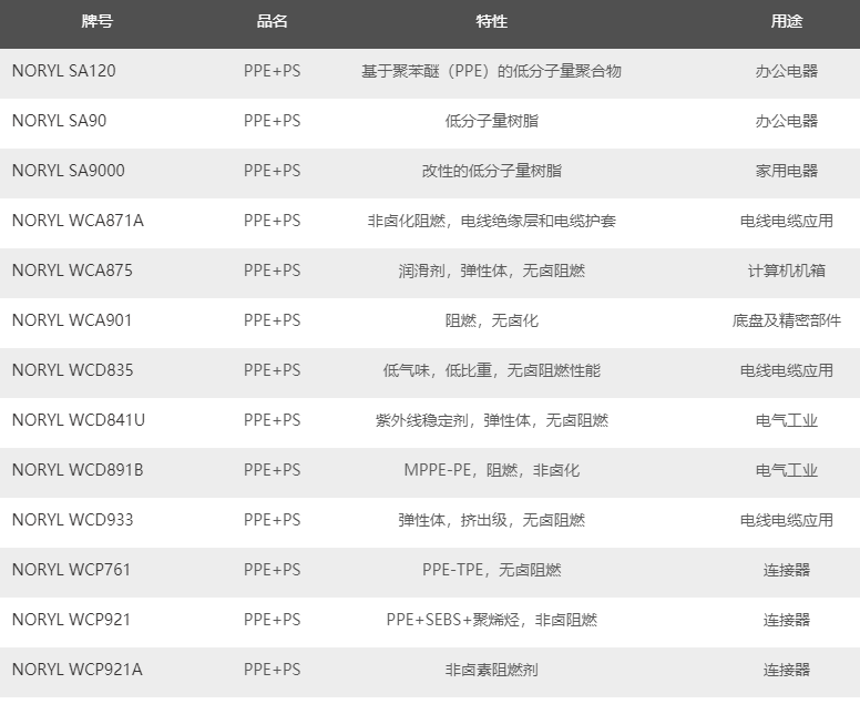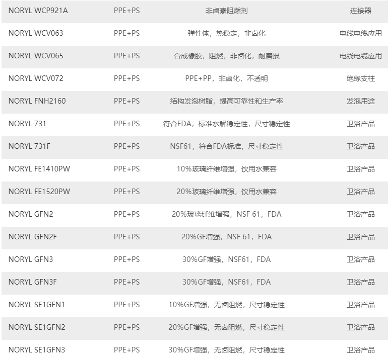 SABIC沙特Noryl PPE/PS塑膠牌號快速查找如下表: