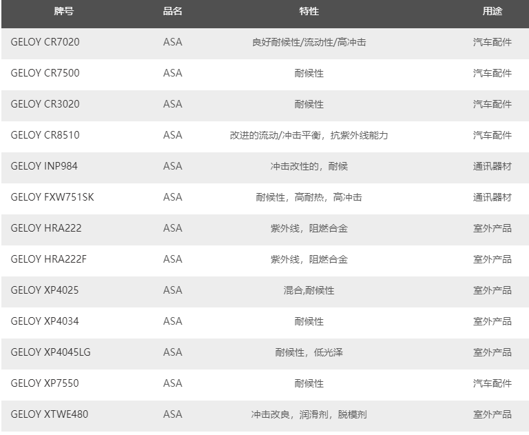 沙特-SABIC的GELOY是由丙烯酸-苯乙烯-丙烯腈的無形三元共聚物(ASA),主要性能為:耐候性、長久使用性、色彩穩(wěn)定性,良好的耐化學性,高耐熱性能和加工性能。
