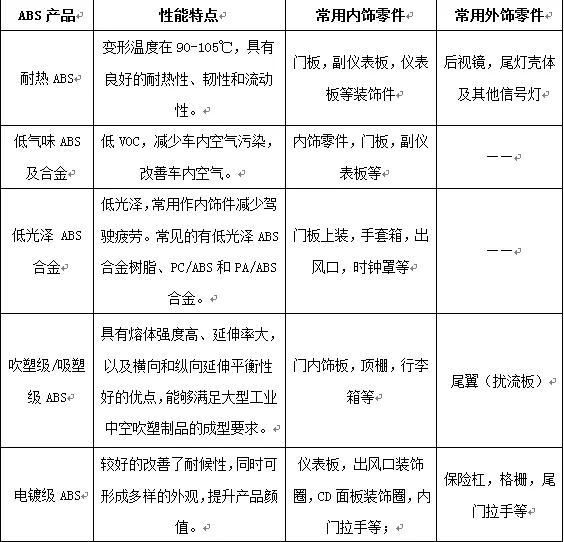 車用ABS材料主要涉及高端高性能ABS材料:耐熱ABS、低氣味ABS及合金、低光澤 ABS合金、吹塑級(jí)ABS、電鍍級(jí)ABS和抗靜電ABS。
