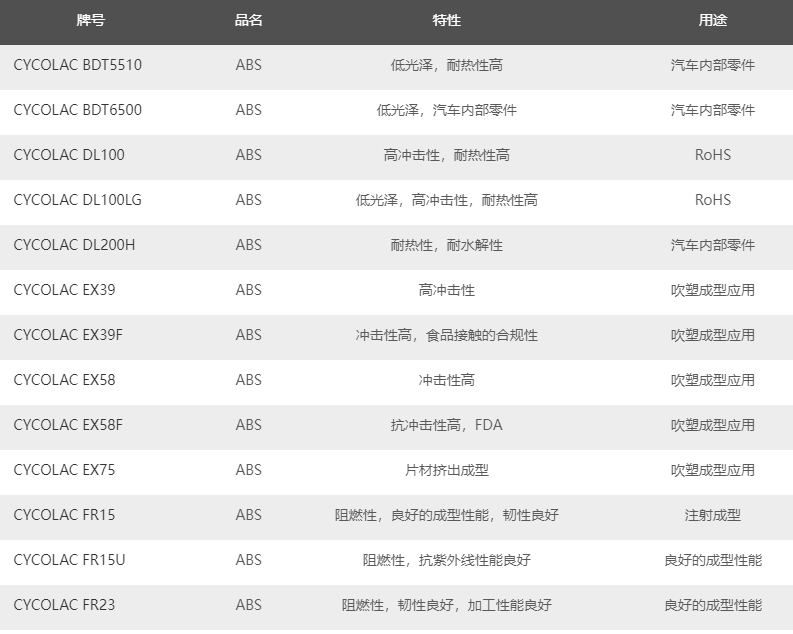 車用ABS塑料沙特-SABIC Cycolac ABS牌號(hào)如下: