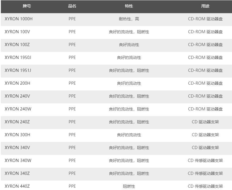 旭化成株式會社成立于1931年,集團總資產(chǎn)達19,151億日元。1979年日本旭化成工業(yè)公司以苯乙烯接枝法生產(chǎn)改性的聚苯醚,商品名為XYRON(采龍)。旭化成擁有PPE/PS、PA/PPE、PP/PPE、PPS/PPE、PPA/PPE等類型;并且,能在這些樹脂中加入玻纖,無機添加劑,著色劑等進行改性,并成為產(chǎn)品。