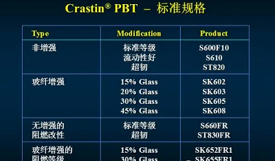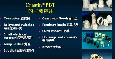 PBT 又可 稱為熱塑性聚酯塑料,為適用于不同加工業(yè)者使用,一般多少會(huì)加入添加劑,或與其它塑料 摻混,隨著添加物比例不同,可制造不同規(guī)格的產(chǎn)品。由于 PBT 具有耐熱性、耐候性、耐 藥品性、電氣特性佳、吸水性小、光澤良好,廣泛應(yīng)用于電子電器、汽車零件、機(jī)械、家用 品等,而 PBT 產(chǎn)品又與 PPE、PC、POM、PA 等共稱為五大泛用工程塑料。