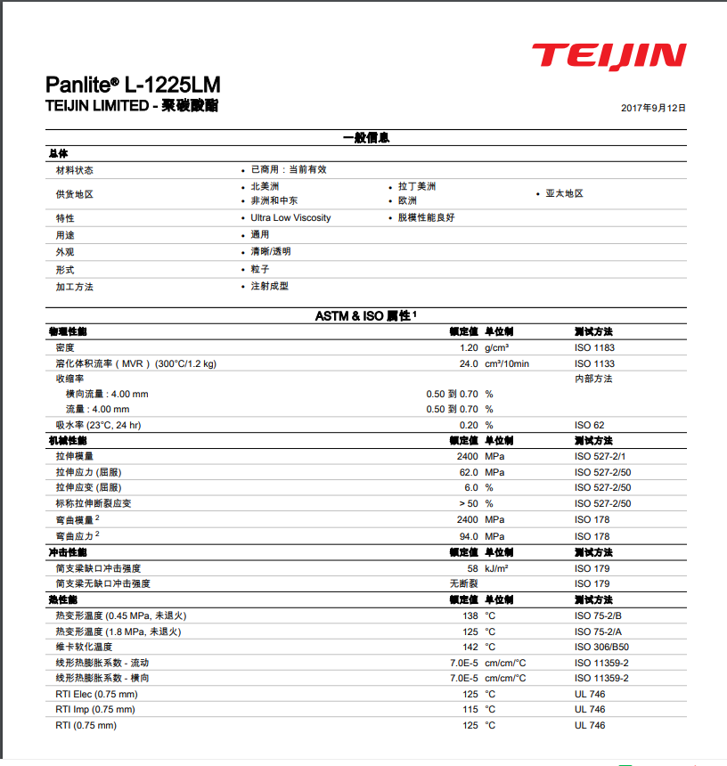 昊恩塑膠貿(mào)易有限公司廠家代理直銷帝人 Panlite L-1225LM,昊恩塑膠貿(mào)易有限公司為您提供詳細(xì)的 日本-帝人 Panlite L-1225LM 物性表參數(shù)。