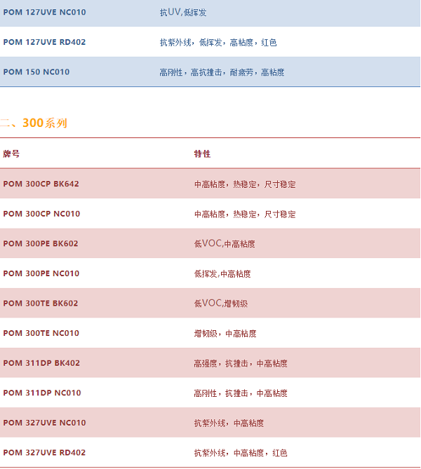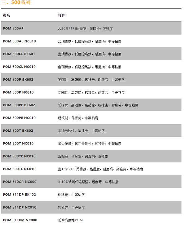 杜邦的聚甲醛主要是按照其粘度來分類的:產(chǎn)品的第一個數(shù)字近似代表其熔融指數(shù),所以按分類有100、300、500、900系列,其熔融指數(shù)隨數(shù)字變大而增大(熔融指數(shù)越大,粘度越小),如粘度比較:POM 100NC010>POM 300CP BK642>POM 500AF>POM 900P BK602。