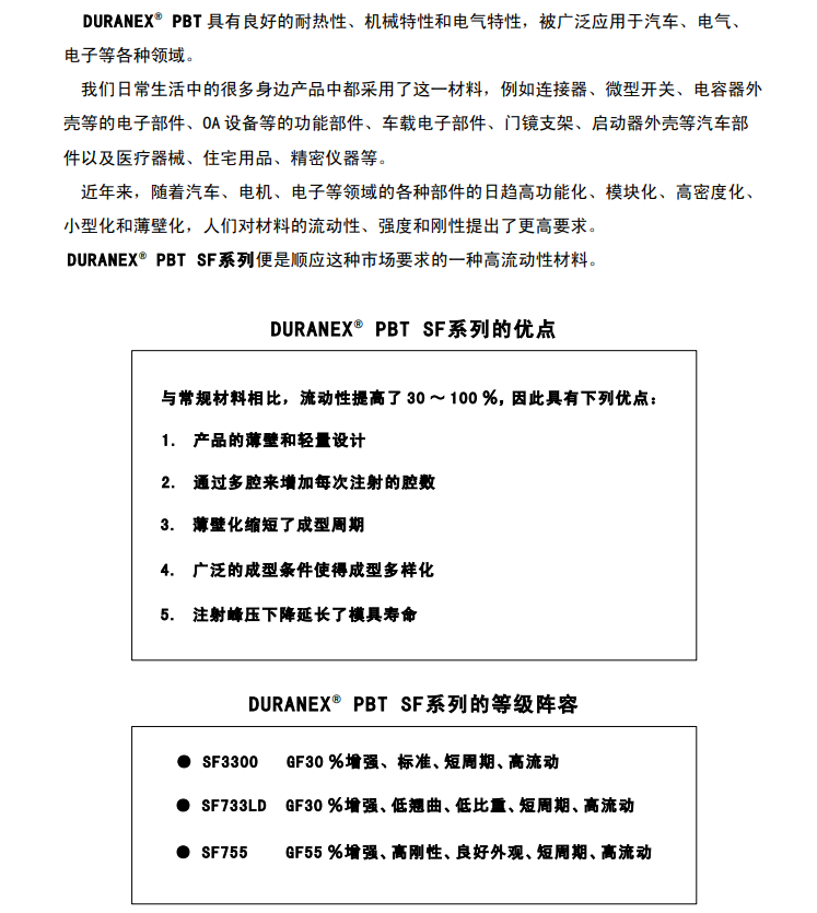 日本寶理塑料DURANEX PBT SF755是一種加纖55%增強,高剛性,優(yōu)質(zhì)外觀性,超高流動性,緩燃的聚酯聚合物,由于它具有高的熔點和結(jié)晶度,由于其吸水率和線性熱膨脹系數(shù)很低,因此具有優(yōu)良的尺寸穩(wěn)定性。此外還有以下主要特性: