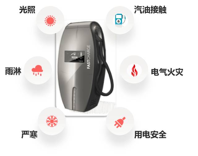 根據(jù)前期調(diào)研發(fā)現(xiàn),充電樁的實(shí)際使用環(huán)境復(fù)雜,有些用于南方沿海環(huán)境,材料將面臨高溫沖擊,高紫外線照射,海邊鹽霧腐蝕等環(huán)境應(yīng)力的影響,充電樁表面溫度可能升至85℃甚至更高,可能使材料軟化,爬電距離和電氣間隙減少,誘發(fā)質(zhì)量事故。長(zhǎng)期紫外線照射會(huì)使材料嚴(yán)重褪色,甚至降低力學(xué)性能,導(dǎo)致材料老化,開裂,影響美觀和安全性能;
