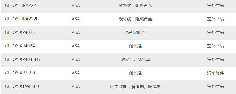 ASA塑料原料產品供應:沙特-SABIC Geloy ASA由丙烯酸-苯乙烯-丙烯腈的無形三元共聚物(ASA),主要性能為:耐候性、長久使用性、色彩穩(wěn)定性,良好的耐化學性,高耐熱性能和加工性能。